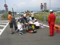 例年に無く暑い大会で、高温時のエンジンセッティングの難しさを実感し、エンジン加速後に電話連絡しているドライバーの声に、コクピットの辛さが伝わってきました。次回は他チームを参考に、通風孔とかドリンクホルダーを考えなくてはです。鈴鹿大会と同じセッティングミス(保温、暖気のやりすぎ)をしてしまい反省の大会でした。大会前のベンチテストでは今年より全重量計測を採用し、減速比A/F値、エンジン温度とよりきめ細かな対応が出来たつもりでしたが、現場ではそれらが生かしきれませんでした。10月の茂木大会では、鈴鹿大会、広島大会の反省点を考慮し、納得できるレースにしたいです。猛暑の中、大会関係者の皆さんにはお世話になり、ありがとうございました。次回もよろしくお願い致します。